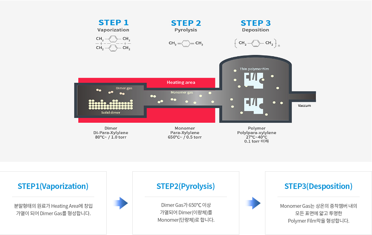 Parylene Coating은 상온의 진공상태에서 가스형태로 형상에 관계없이